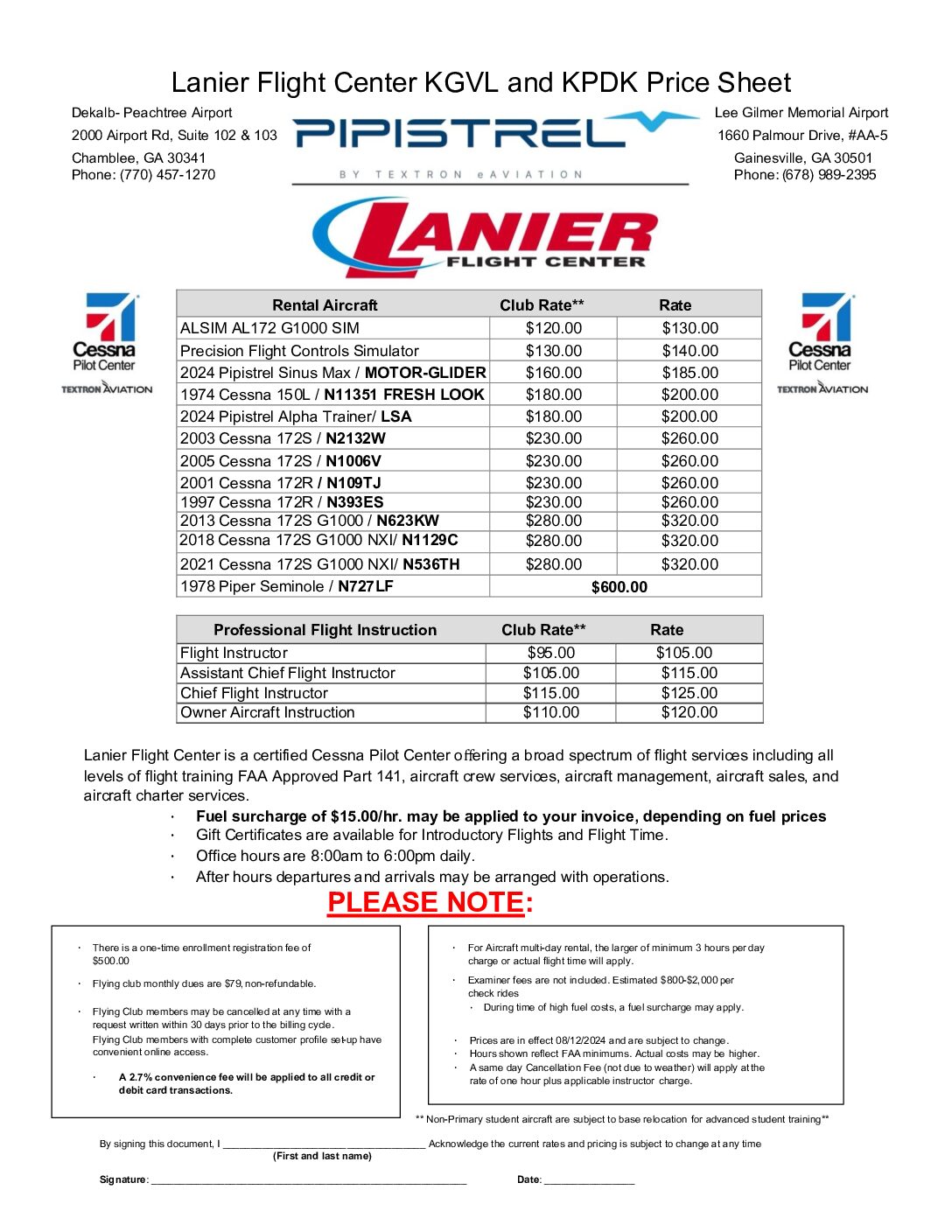 LANIER FLIGHT CENTER GAINESVILLE AND PEACHTREE DEKALB LOCATION AIRCRAFT RATES: